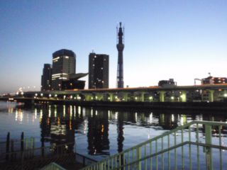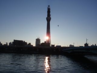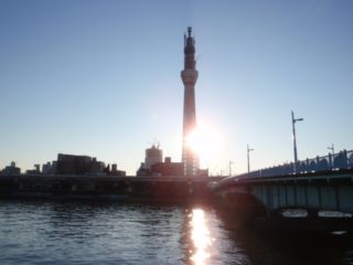 | ○隅田川対岸からツリーの足元に昇る≒初日 | ○建設中の初日の出は、今年だけですね。 | ||||